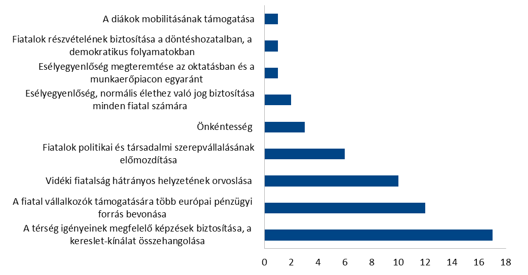 A beérkezett szavazatok alapján elmondhatjuk, hogy az emberek leginkább a térség igényeit kielégítő képzések biztosítását tartják a legégetőbb megoldásra váró problémának, azonban több európai uniós pénzügyi forrás bevonását is nagy számban szorgalmazták kitöltőink. Az esélyegyenlőség biztosítására szükséges nagyobb hangsúlyt fektetnünk, mely a konzultációból is egyértelműen látszik.